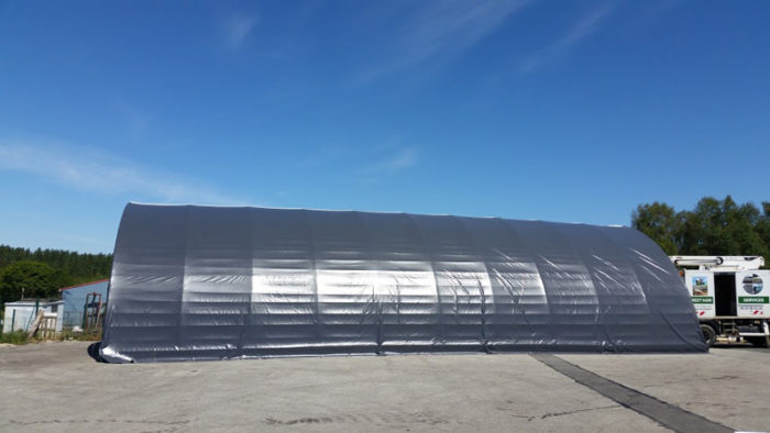 Pour le stockage, l'équipe BATICLAIR a installé un tunnel ABRICLAIR de 10m50 de large avec l’ossature en tube rond galvanisé de 90mm de diamètre.